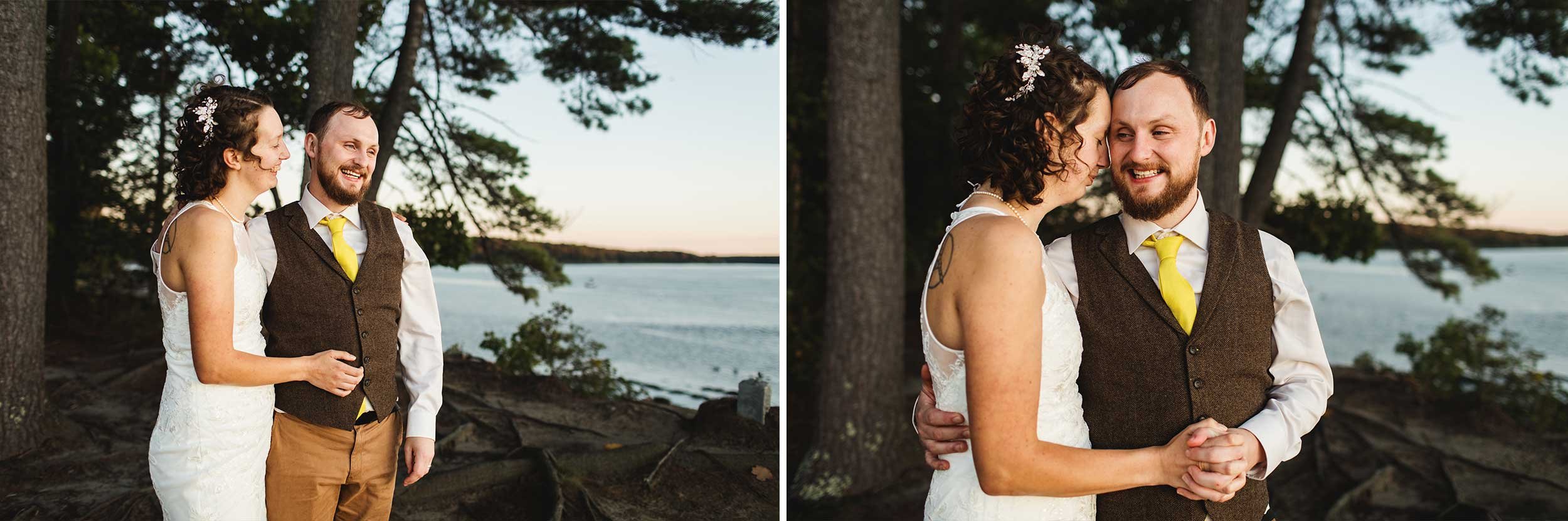 The rest of the day was a blur of so many moments from sweet to funny. The couple choreographed their first dance and performed it spectacularly. At sunset, we walked out to a view of Great Bay and I captured golden hour portraits of the newlyweds. Instead of snapping photos constantly, I tried to give them a moment of peace to just watch the sunset behind the distant pines. Once we returned to the reception, the guests welcomed them back with so much more dancing and fun. They also had a sparkler send off towards the end of the night. I love how you can see their giddiness beam through those photos.
